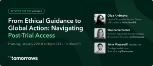 Consequently, planning for “Post-Trial Access” (PTA) – the provision of an investigational treatment to patients who have completed a clinical trial – is a critical part of clinical development. In practice, PTA planning must address a broad range of access-related challenges including treatment specific supportive medical care, infrastructure required for treatment administration, and the associated costs.